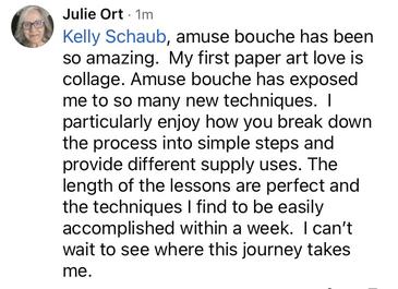 Collage-Lab has so many fun opportunities to expand my collage knowledge! I really enjoyed Treasure Trovember last year and signed up for Amuse Bouche this year with new lessons every week! Amuse Bouche has really exposed me to different techniques and tools I wasn't familiar with that I really want to try to incorporate into my work! I look forward to each Monday's lesson! So far my favorite was "Excavation " which i plan to try again soon!